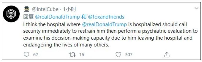 有网友就嘲讽道:「我看特朗普住的医院应该立刻叫保安来管管他,然后做一下精神评估,看看他还有没有决策能力。他要这么离开医院,会危及很多人的性命的。」