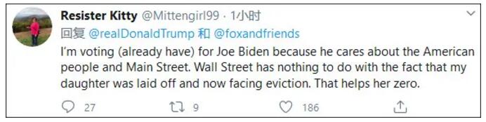 有一些网友还公开唱反调,表示要给拜登投票:「我已经给拜登投票了,他才关心美国人。我女儿被解雇,还面临被驱逐的命运,可华尔街什么都没做。」