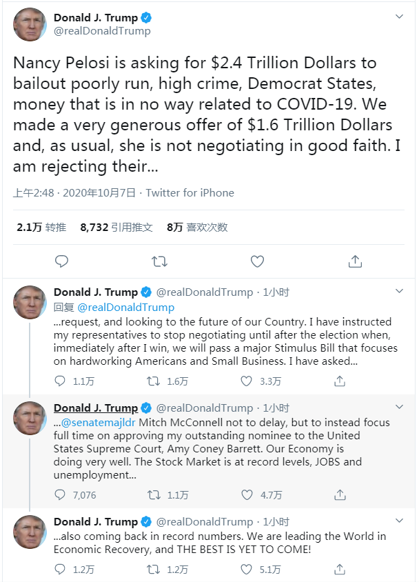 特朗普在推文中稱,眾議院議長佩洛西提出的2.4萬億美元援助計劃只是用來資助那些民主黨控制的、經營不善、高犯罪率的州,她的援助計劃與新冠疫情毫無關係。而共和黨方面提出的1.6萬億美元援助計劃則非常慷慨。他指責佩洛西在談判中沒有表達出誠意,因此已指示自己的代表們停止繼續進行談判。
