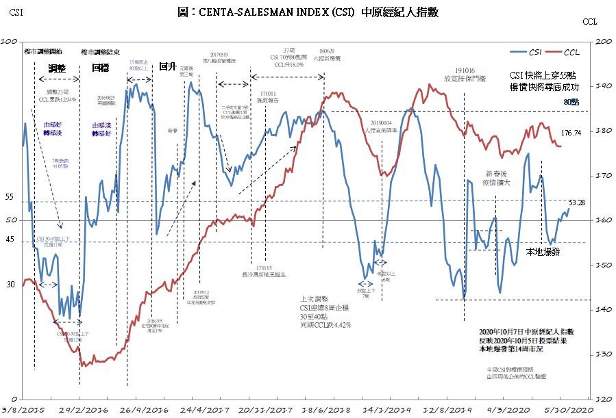 他續指,樓市氣氛持續向好,用家釋放購買力,支持一手及二手成交向上。展望CSI快將上衝55點好淡分界區間上限,如果升穿55點,預示樓市結束調整,樓價將重拾升軌。樓市逐步回穩,CSI近6周企穩50點附近,未有重返44點水平。同期樓價亦開始尋底階段,CCL按周跌幅持續收窄,並於176點窄幅徘徊。隨著二手買賣穩步增加,相信CSI走勢會跟隨上揚,樓價有望見底回升。(圖源 中原地產)