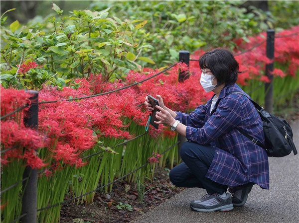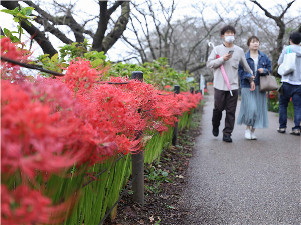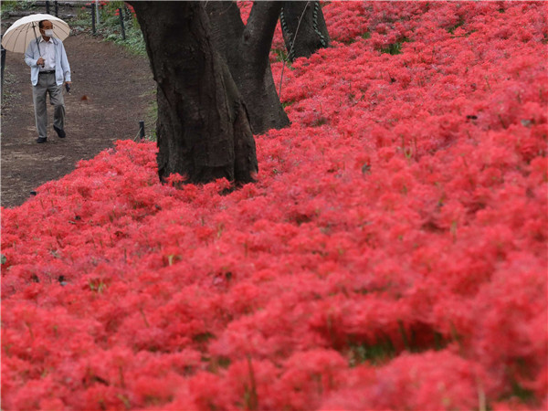 10月7日,遊人在日本埼玉縣幸手市欣賞權現堂公園內的曼珠沙華。