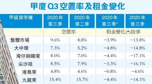 房地產服務提供商世邦魏理仕7日發表報告指,第三季甲級寫字樓空置面積升至780萬平方呎,升至20年以來最高水平,空置率為9.6%,料全年或擴大至10%。大中環區的空置率在季內錄最大升幅,上升2.1個百分點至7.3%,淨吸納量為負45.3萬平方呎,屬有紀錄以來最大負值。九龍東是唯一在本季尾錄得正淨吸納量的分區市場,淨吸納量為4.8萬平方呎。