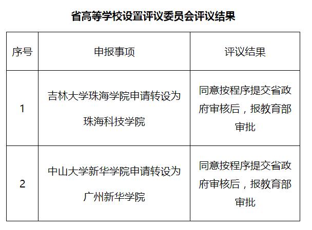 廣東省教育廳今日公布《關於省高等學校設置評議委員會評議結果的公示》,經广东省省高等學校設置評議委員會專家考察和評議,同意按程序將吉林大學珠海學院轉設為珠海科技學院、中山大學新華學院轉設為廣州新華學院的申報材料報請省政府審核後,報教育部審批。