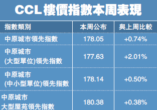 最新的CCL報178.05,按周升約0.74%,指數連升兩個星期。中原地產研究部高級聯席董事黃良昇表示,早前CCL連續五周企穩176點水平,跌幅持續收窄。上周CCL開始微升,本周成功升穿178點,有迹象顯示尋底成功,如果下周沒有重返176點水平,即可確認樓價成功見底,展望中秋前後樓價可以重拾升軌,將於未來數周公布的CCL開始反映。