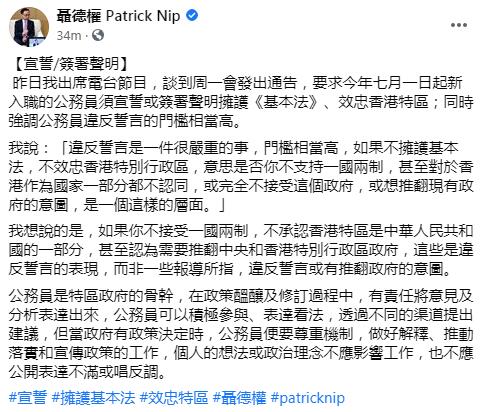 公務員事務局局長聶德權今日(11日)在社交網站發文,回应早前出席電台節目時提及,明日(12日)將向各部門發通告,要求今年7月1日起新入職的公務員須宣誓或簽署聲明擁護基本法及效忠香港特區。他強調如果公務員不接受「一國兩制」,不承認香港特區是中華人民共和國的一部分,甚至認為需要推翻中央和香港特別行政區政府,這些就是違反誓言的表現。他澄清,並非一些報道所指,違反誓言或有推翻政府的意圖。