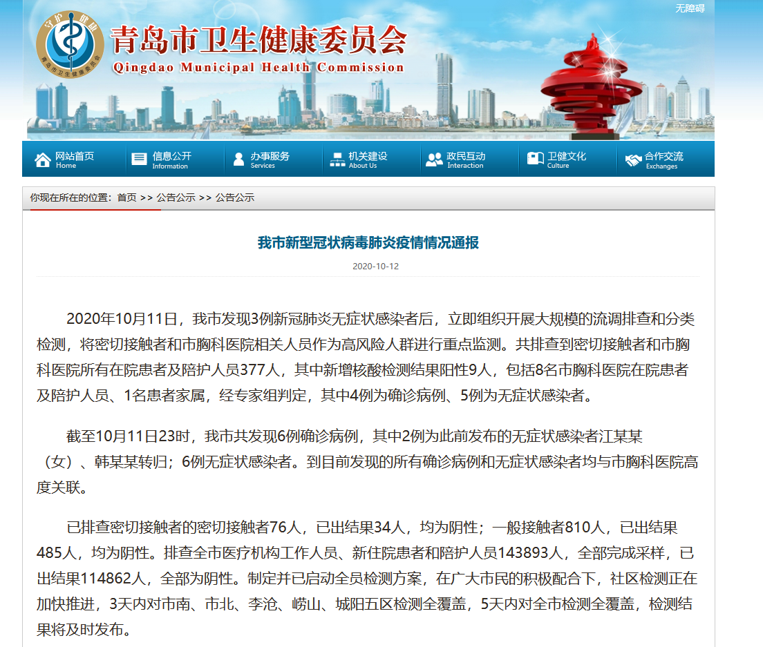 據青島市衛健委網站消息,2020年10月11日,青島市發現3例新冠肺炎無症狀感染者後,立即組織開展大規模的流調排查和分類檢測,將密切接觸者和市胸科醫院相關人員作為高風險人群進行重點監測。共排查到密切接觸者和市胸科醫院所有在院患者及陪護人員377人,其中新增核酸檢測結果陽性9人,包括8名市胸科醫院在院患者及陪護人員、1名患者家屬,經專家組判定,其中4例為確診病例、5例為無症狀感染者。