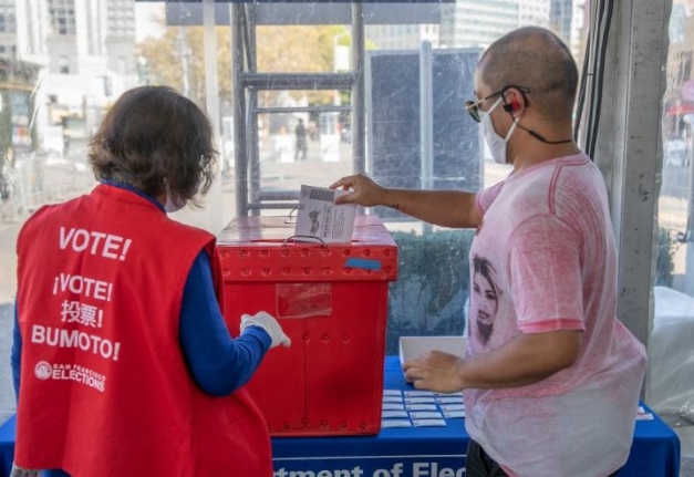 10月5日,美國舊金山選民在舊金山市政廳戶外投票中心參加提前投票。新華社發(李建國攝)