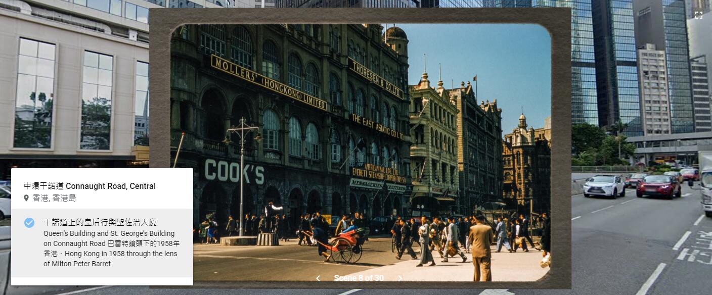 網上同步舉行「時光藝遊舊香港」,把展品置入現代香港街景作新舊對比。圖為1958年巴雷特鏡頭下的中環與今日中環對照。