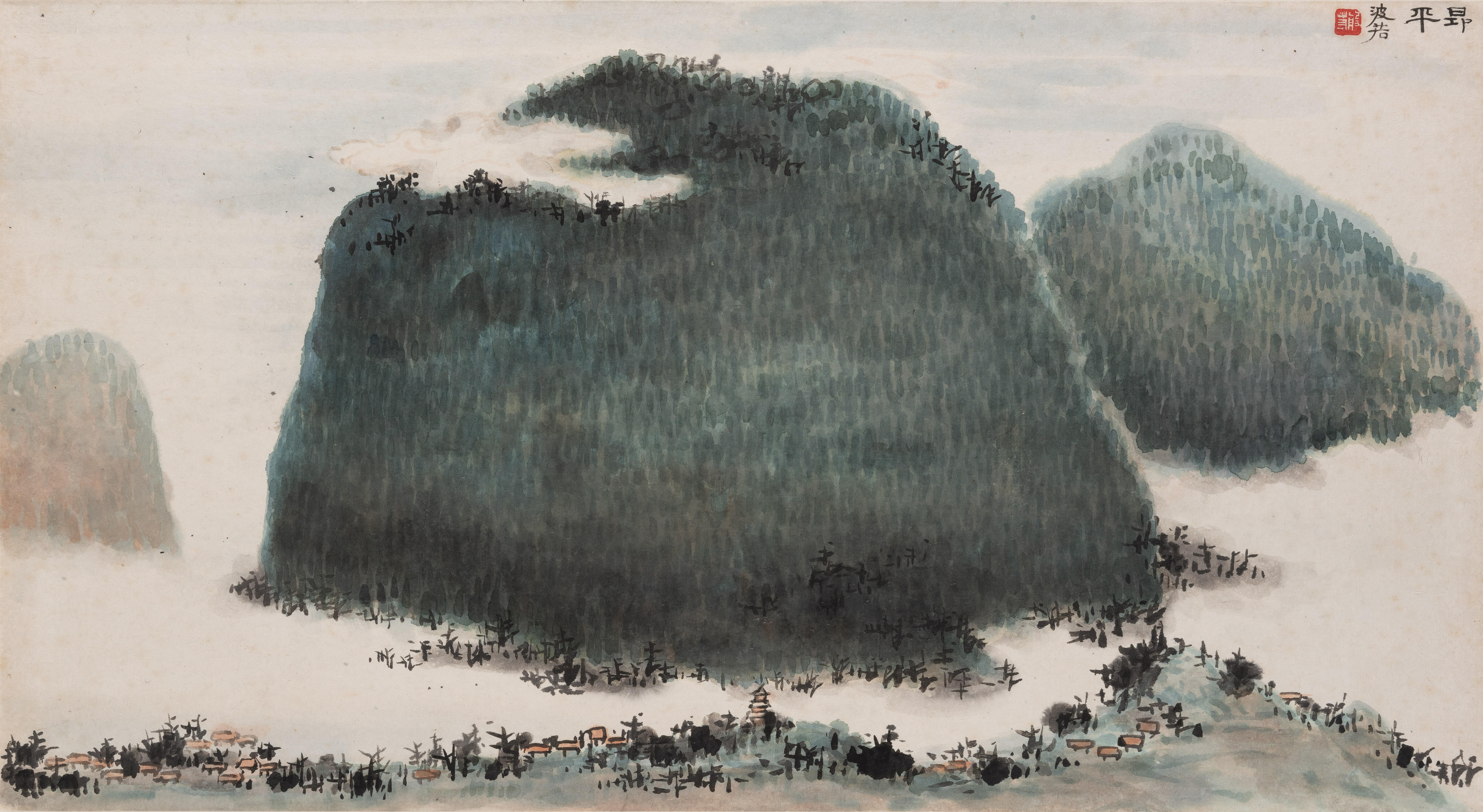 葉因泉作品《東方明珠圖》,1953年。畫作結合了中、西寫法,利用了光影和透視增加立體感和真實感,同時以古代畫家董巨的披麻皴和墨點寫山石樹林。