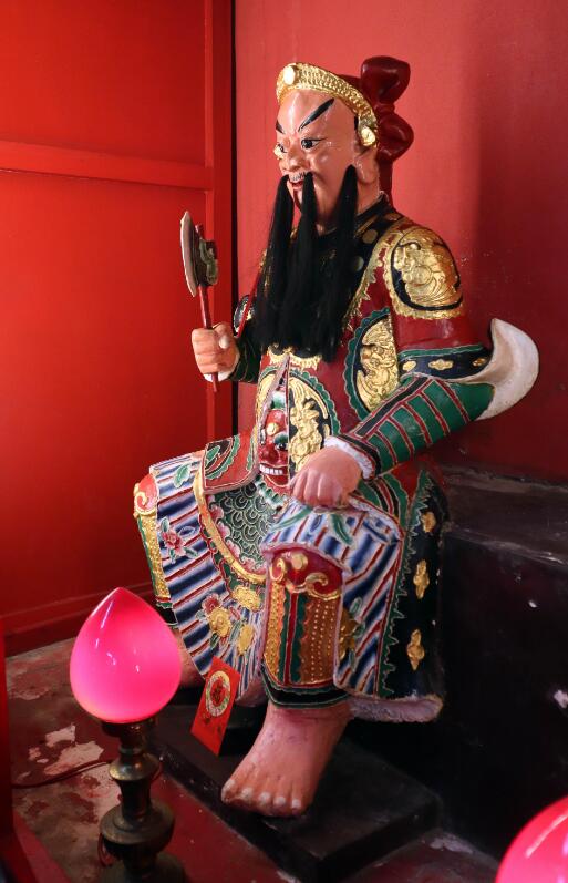 正殿前方豎立金童、玉女,及朝江、望海共四尊塑像,外貌古樸。值得留意是側殿的神像,左側供奉醫靈和赦官,右側供奉洪聖和車公。赦官即地官,主管赦罪,香港民間廟宇供奉赦官只此一家,每年農曆七月居民在廟前舉行盂蘭活動。另外,車公造型亦頗特別,赤腳持斧,與元朗舊墟大王古廟(康熙年間)和橫洲二聖宮(1718年)的車公像相似,但與蠔涌車公古廟(1904年重修)和沙田車公古廟(1890年重修)的車公像截然不同。