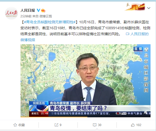 10月16日,青島市委常委、副市長薛慶國在受訪時表示,截至16日18時,青島市已經全部完成了10899145份核酸檢測,檢測結果全都是陰性,說明目前基本可以排除疫情社區傳播的風險。
