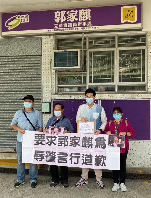 反對派立法會議員郭家麒月初於網上發表辱警言論,引起社會強烈不滿,昨日分別有兩批市民到立法會及其位於葵芳邨的議員辦事處門外抗議。他們促請政府跟進事件,及要求郭家麒向警方和公眾公開道歉。