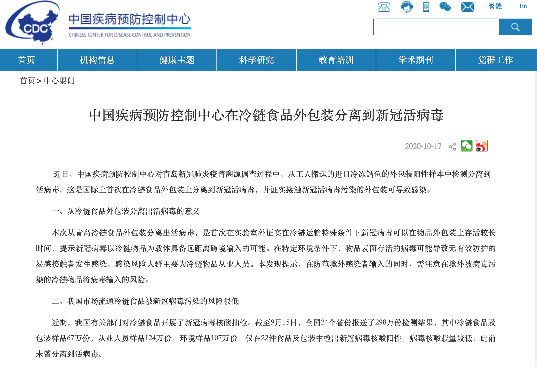 據中國疾控中心網站10月17日消息,近日,中國疾病預防控制中心對青島新冠肺炎疫情溯源調查過程中,從工人搬運的進口冷凍鱈魚的外包裝陽性樣本中檢測分離到活病毒。這是國際上首次在冷鏈食品外包裝上分離到新冠活病毒,並證實接觸新冠活病毒污染的外包裝可導致感染。