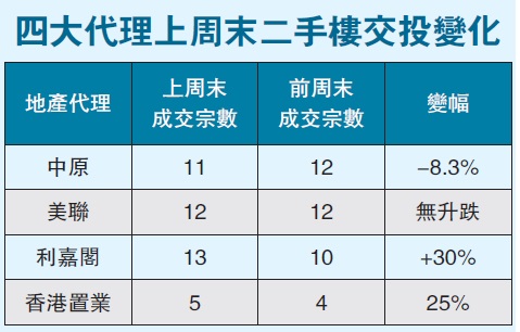 據上周末四大地產代理公布的二手樓交投資料顯示,中原上周末錄得11宗成交,較前周12宗下跌8.3%;美聯則持平,上周與前周都錄得12宗成交,沒有升跌,至於利嘉閣及香港置業,上周分別錄13宗及5宗二手成交,按周升30%及25%。