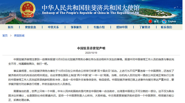 中國駐斐濟大使館19日發布聲明稱,注意到了一些社交媒體報道了10月8日台北駐斐濟貿易辦事處在大太平洋酒店舉辦的活動會場外發生的事情。報道中對中國使館工作人員的指責與事實完全不符,純屬顛倒黑白、倒打一耙。中國駐斐濟大使館回應外交官打人傳聞。