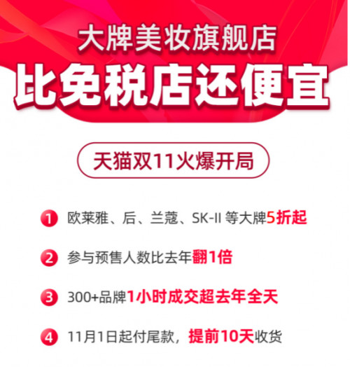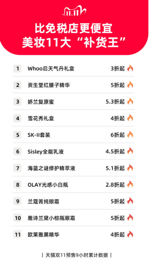 今年受疫情影響,國內消費者無法出境消費,國際美妝大牌官方旗艦店紛紛推出史上最優惠力度,各種買贈權益疊加,比免稅店還划算。Whoo後天氣丹禮盒 3折起、歐萊雅黑精華4折起、資生堂紅腰子精華5折起……這些爆品成了天貓美妝11大「補貨王」。有網友笑稱:「雙11熬最晚的夜,當然要搶最好的眼霜。」