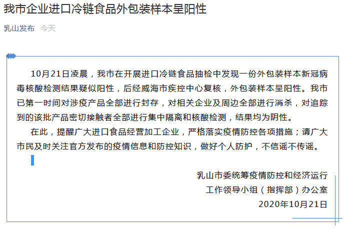 10月21日淩晨,乳山市在開展進口冷鏈食品抽檢中發現一份外包裝樣本新冠病毒核酸檢測結果疑似陽性,後經威海市疾控中心覆核,外包裝樣本呈陽性。乳山市已第一時間對涉疫產品全部進行封存,對相關企業及周邊全部進行消殺,對追蹤到的該批產品密切接觸者全部進行集中隔離和核酸檢測,結果均為陰性。