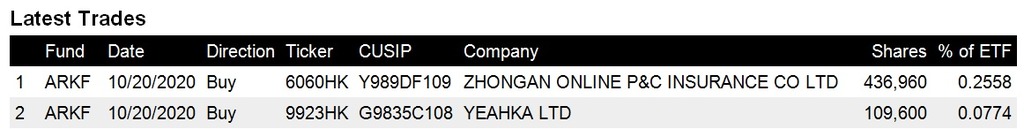 香港科技股吸引越來越多國際資金流入!美國基金公司Ark Invest旗下Ark Fintech Innovation ETF(美︰ARKF)交易紀錄顯示,該基金昨日(20日)增持了眾案在線(6060)及移卡(9923)。