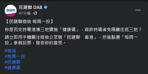 民建聯今日(22日)在社交平台發問,題目為你是否支持粵港澳三地實施「健康碼」,容許持碼者免隔離往返三地?