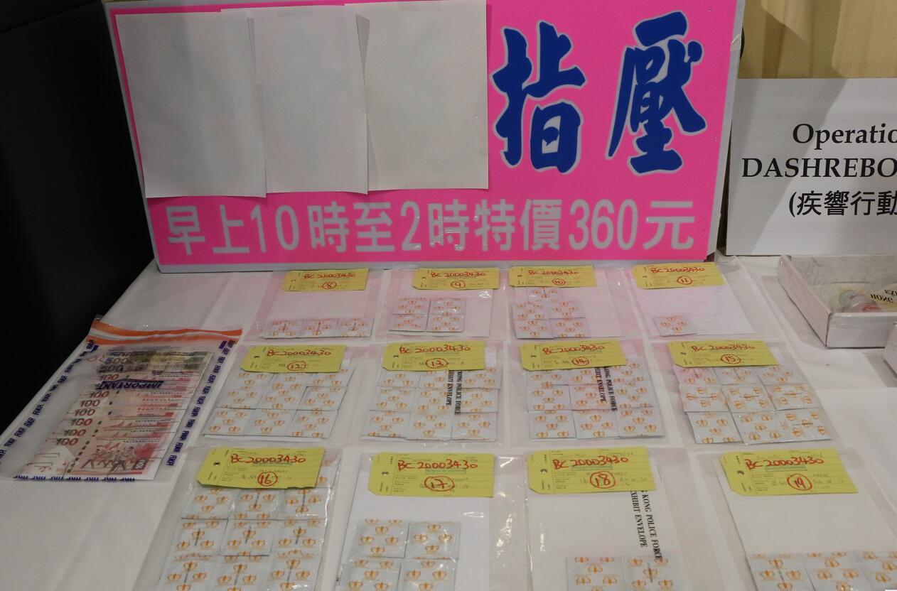 警方在行動中,合共檢獲10部釣魚機、約2.2萬隻色情光碟、約34克「K仔」、約7克冰毒、約6克可卡因、約5克霹靂可卡因、一批酒精類飲品、約2.4萬元現金等,行動中所檢獲的證物,總值逾70萬港元。