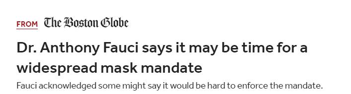 他表示,如果人們沒有戴口罩,那麼也許我們應該強制這樣做。福奇說,當前將經濟重啟與公共衛生措施割裂的看法和做法是不合適的,是完全扭曲的。公共衛生措施是保障經濟重啟的基礎,而不是障礙。