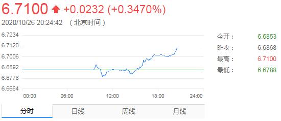 離岸人民幣兌美元持續走低,跌破6.71關口,日內跌幅擴大至逾400個基點。