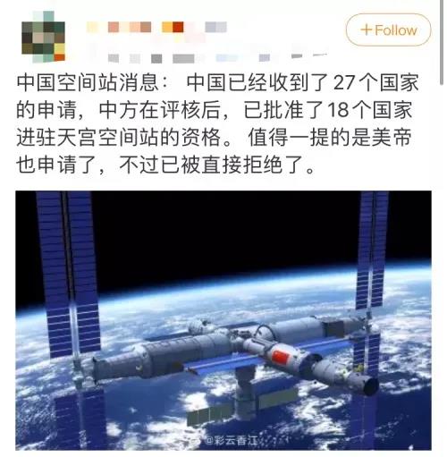 「系統提醒,中國拒絕了您的好友請求。」26日,一則「中國空間站將美國拒之門外」的消息在微博傳開。
