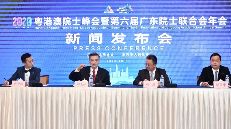 27日上午,2020粵港澳院士峰會暨第六屆廣東院士聯合會年會(統稱院士峰會)新聞發布會在廣州召開。記者獲悉,峰會將於11月2日至4日在廣東東莞舉行。會議由廣東院士聯合會與東莞市人民政府共同舉辦。中國工程院院士、廣東院士聯合會會長、粵港澳院士專家創新創業聯盟(廣東)主席劉人懷,東莞市委常委、松山湖黨工委書記劉煒等出席發布會。