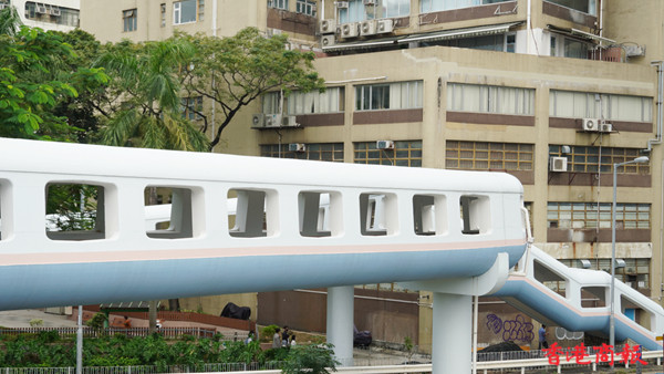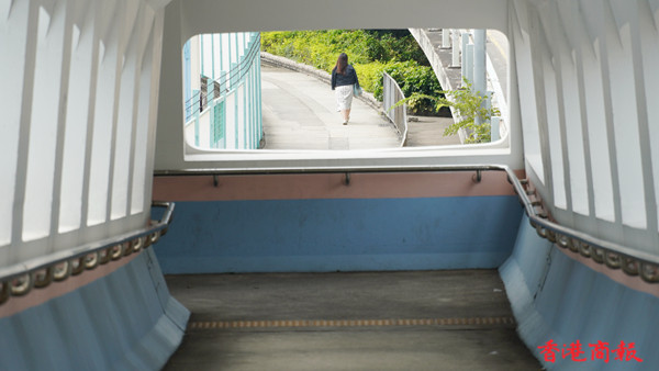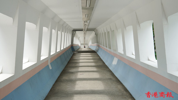 「志明橋」於1970年末至1980年初修建,由政府工程師設計,着重實用及耐用性。天橋的石屎用料堅固,上蓋讓行人免於雨淋日曬,類似圓拱形隧道的頂部設計亦方便去水。雖然「志明橋」在設計上沒有美學考慮,但其外牆以粉色和藍色為主調,產生清新的感覺。橋身兩旁設有多個長方形風口位,從內看外能形成電視框的構圖。(記者馮俊文攝)