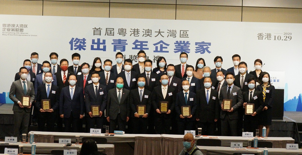 首屆「粵港澳大灣區傑出青年企業家評選活動」頒獎典禮於2020年10月29日下午三時在香港、深圳、澳門三地同步舉行,香港分會場活動假灣仔會展中心舉辦。香港特別行政區政務司司長張建宗,澳門經濟財政司司長李偉農,香港中聯辦副主任譚鐵牛,全國政協常委蔡冠深,深圳市人民政府副市長艾學峰等擔任主禮嘉賓。此次比賽匯聚粵港澳大灣區內各業青年才俊,經過嚴格的選拔和評判,共有78位青年企業家獲頒六大獎項:傑出青年企業家、以及傑出青年企業家的最佳創業獎、最佳科技創新獎、最佳文化創意獎、最佳商業服務獎、最佳社會責任獎。34人榮獲傑出青年企業家稱號。