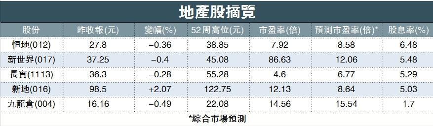 目前具有穩定派息的地產股息率逾5厘,葉尚志稱,投資者可買入作為防守,然後再搭配一些潛力大的新經濟股作輔助。雖然現時本港地產股的股價較每股資產淨值(NAV)折讓幅度約50%,收租股折讓幅度更大,達60%至70%,但他建議投資者長期持有,一是因為地產商每年放出的單位少,即供應端少;二是具有投資潛力的地產股有足夠的土地儲備。