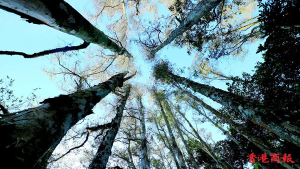 雨季時可欣賞到水浸白千層奇觀,沒有水時這裏風景開掦,遠眺對岸翠綠樹林,形成優美的倒影,令人想起黃霑先生一首歌的歌詞:「湖海洗我胸襟,河山飄我影蹤,雲彩揮去卻不去,贏得一身清風。」細心望向水中,小魚游弋,微風輕拂,為緊張的疫情生活帶來點點心靈治癒。(記者馮瀚文攝)
