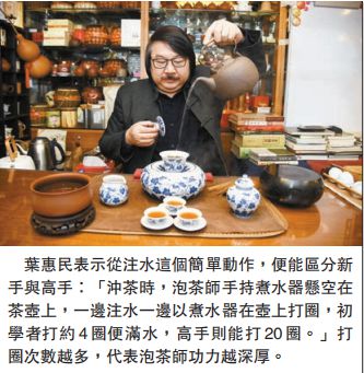 要成為茶藝師,拜師學藝是主要途徑,也可參與坊間的培訓班。葉惠民曾教過數萬名學生,但入室弟子只有8位,他坦言喜歡茶藝的人有很多,但真正願意將之作為職業者卻寥寥可數,主因是收入不高,普遍茶藝師的月薪約2萬港元,若開班授課就會有多些收入。