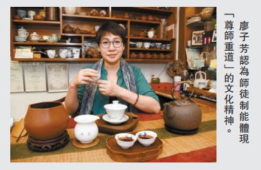 跟隨葉惠民20多年的入室弟子廖子芳表示,她是依循傳統師徒制學藝,雖不至要替師傅洗衫煮飯,但必須懂得如何侍候師傅,她說:「聽到師傅咳一聲,就知道他要水,並要預備好茶具等,要學會捕捉師傅心思。」問到對比師徒制與學院派的優劣時,廖子芳認為師徒制更能體現出茶道中的「尊師重道」,而非單純你付款、我授課的交易。
