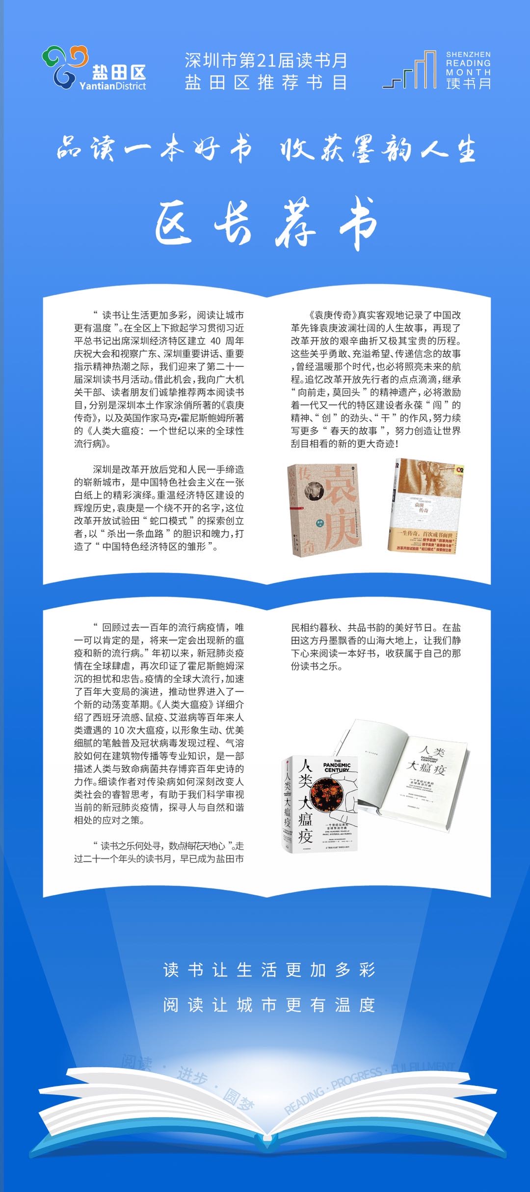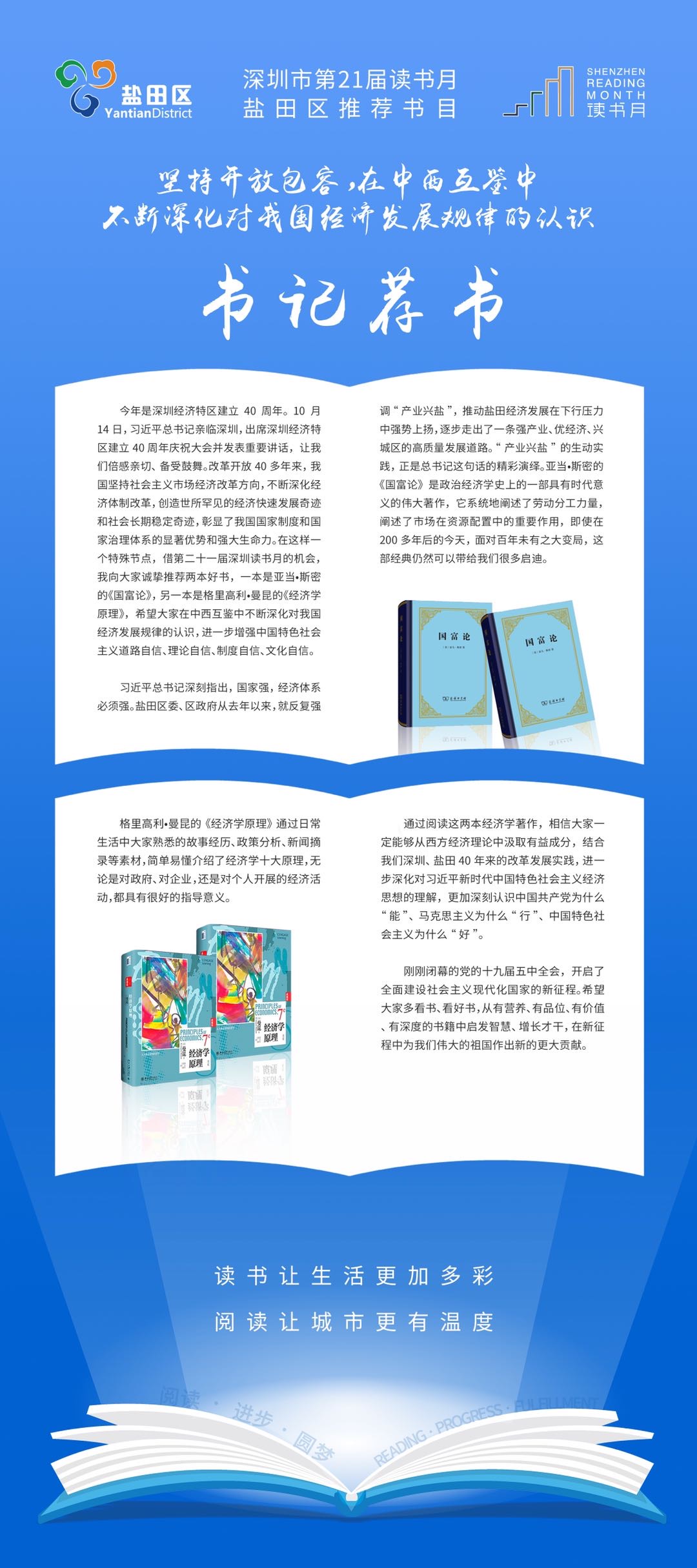 特別引人關注的是,本屆讀書月期間,鹽田區委書記陳清、區長鄧飛波也是「薦書人」。陳清推薦了亞當·斯密的《國富論》和格里高利·曼昆的《經濟學原理》兩本書籍,「希望大家在中西互鑒中不斷深化對我國經濟發展規律的認識,進一步增強中國特色社會主義道路自信、理論自信、制度自信、文化自信。」鄧飛波則推薦了深圳本土作家涂俏所着的《袁庚傳奇》和英國作家馬克·霍尼斯鮑姆的《人類大瘟疫:一個世紀以來的全球性流行病》,「品讀一本好書,收穫墨韻人生。在鹽田這方丹墨飄香的山海大地上,讓我們靜下心來閱讀一本好書,收穫屬於自己的那份讀書之樂。」