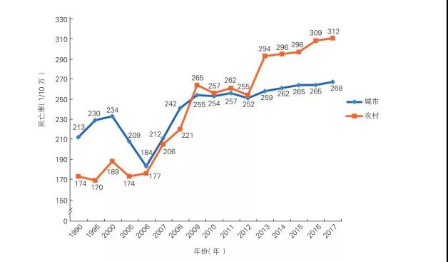1990—2017年中國城鄉居民心血管病死亡率變化