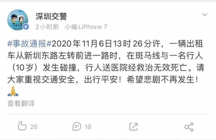 11月7日上午,深圳交警發布通報稱,2020年11月6日13時26分許,一輛出租車從新圳東路左轉前進一路時,在斑馬線與一名行人(10歲)發生碰撞,行人送醫院經救治無效死亡。