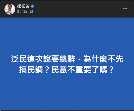 針對泛民議員聲稱如果有人被DQ將集体請辭的言論,全國政協副主席梁振英今天(10日)在社交平台發文指,泛民表示要總辭,但事前卻沒有進行民調,因此梁振英質問他們是否認為民意不重要了。(圖片來源:全國政協副主席梁振英臉書專頁)