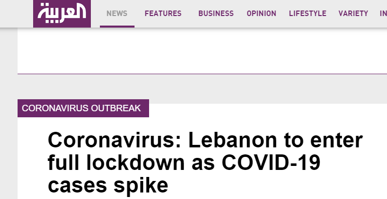 據阿拉伯國有電視台(Al Arabiya)報道,黎巴嫩宣布全國封鎖16天,以遏制新冠病毒傳播。