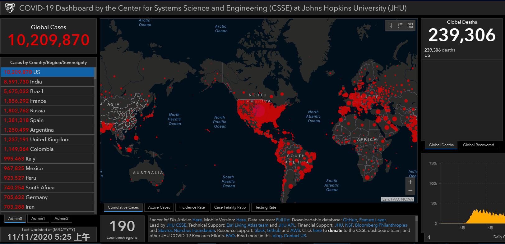 據美國約翰斯·霍普金斯大學的統計數據顯示,截至香港時間11日5時25分左右,美國新冠肺炎確診病例已超過1020萬例,達到10209870例;死亡病例近24萬例,達到239306例。