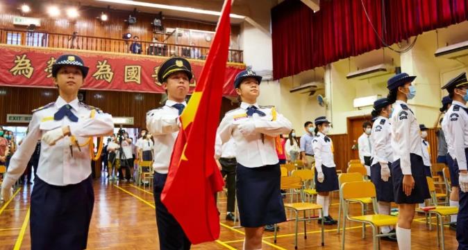 2019年9月23日,解放軍駐香港部隊儀仗隊官兵來到香港培僑中學,為該校師生舉行升旗禮。