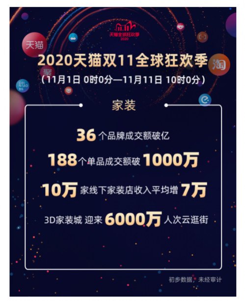 11月1日至11日10點,100層的「天貓3D家裝城」里迎來6000萬人次「雲逛街」。天貓家裝累計誕生188個成交額破1000萬的單品,林氏木業、全友家居、源氏木語、索菲亞、歐派、喜臨門等36個品牌成交額突破1億元,創造了家裝行業今年以來的增長峰值。