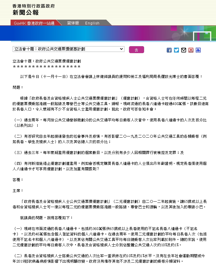 勞福局又指出,2元乘搭優惠計劃下,相關受惠人士佔總客量比率正逐年上升,由2018年1月的平均每日37.82萬人(約佔整體7%),上升至2019年12月的48.5萬人(約佔整體10%)。使用2元優惠計劃的平均每日乘客人次中,長者及合資格殘疾人士分別佔整體公共交通人次約一成約1%,在去年社會運動期間,或今年疫情影響下,未見明顯改變。