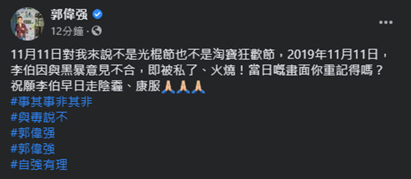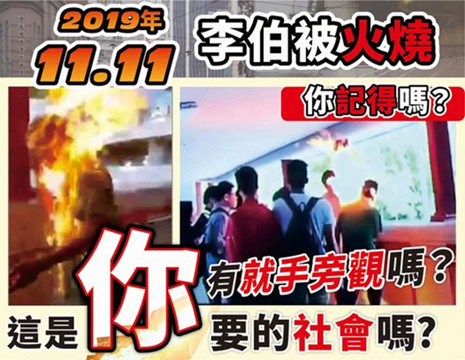 工聯會立法會議員郭偉强在社交平台表示,今日(11月11日)令他回想起去年的馬鞍山燒人事件,57歲的李伯當日與他人在鞍駿街的行人天橋上爭執,其後有人向他淋潑懷疑易燃液體並點火,李伯整個人因此起火,他的上半身及頭部燒傷。郭偉强在貼文中反問市民能否憶起當日情景,他並在貼文祝願李伯早日康復和早日走出陰霾。(记者 唐信恒)