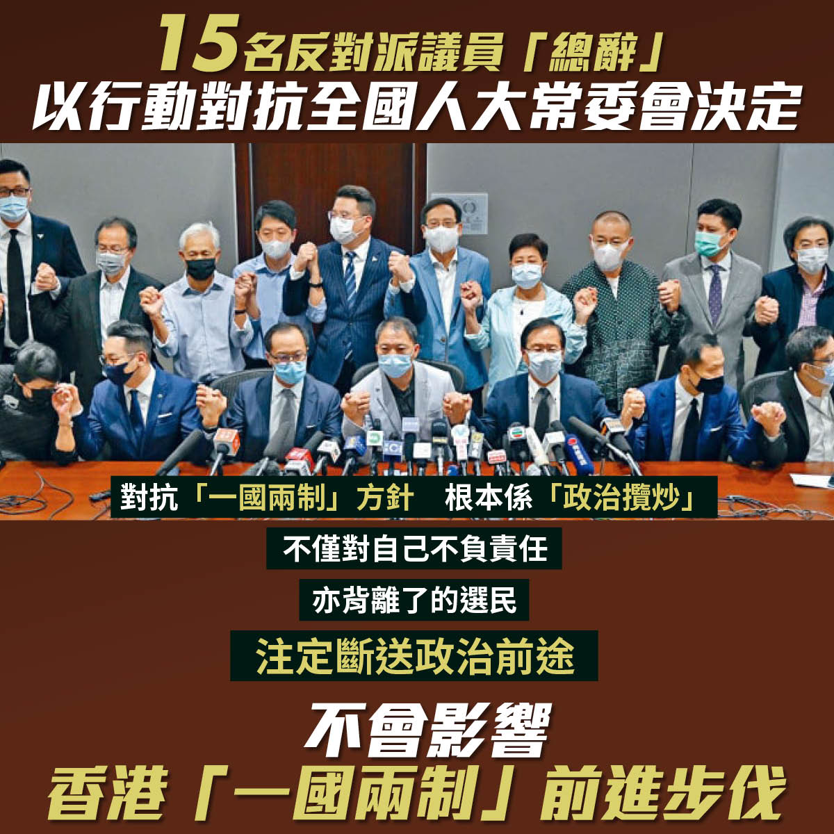 4名攬炒派議員被全國人大常委會DQ,另外15名攬炒派議員昨日亦宣布集體辭職,若15人的辭職信今日即時生效。全國人大常委會早前表決通過香港第六屆立法會繼續履行職責不少於一年的決定,社會各界都希望攬炒派議員珍惜延任機會,不要再搞事生非。但攬炒派議員延任後繼續無底線拉布,攬炒香港,更抓住一切機會聲援「港獨」分子,危害國家主權、安全和發展利益。他們的惡行已經成為香港當前的最大威脅,引起社會巨大反彈,連日來多個團體舉行示威抗議,要求嚴懲攬炒議員。