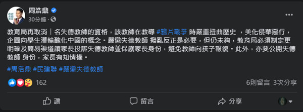 民建聯立法會議員周浩鼎在社交平台回應教育局再取消一名教師註冊的事件。他認為有必要嚴懲失德教師、撥亂反正,而教育局也需制定更明確及簡易渠道讓家長投訴失德教師並保護家長身份,以避免教師向孩子報復。周浩鼎亦指因家長有知情權,所以建議要公開失德教師身份。