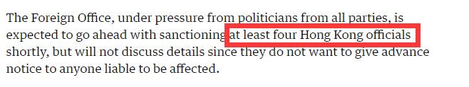 卫报称,英國外交部在各個政黨壓力下,預料將在短期內「制裁」至少4名香港官員。