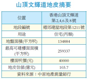 地政總署公布,公開招標出售山頂文輝道第2、4、6及8號的鄉郊建屋地段第1211號的用地。土地地段面積13.5萬平方呎,最高可建樓面面積近26萬平方呎,預計涉及240伙住宅單位。季初時有測量師估計,每方呎樓面地價料3萬至4萬元,預計投標金額介乎78億至104億元。
