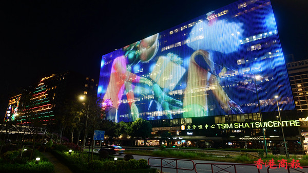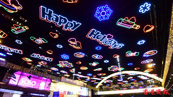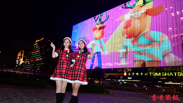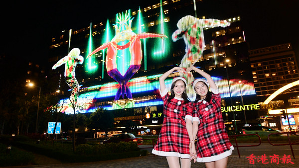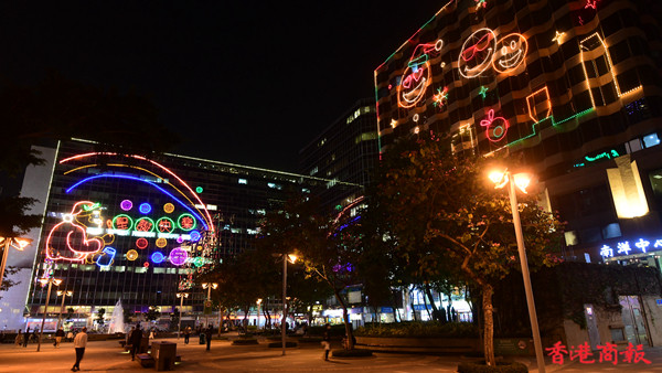 一年一度的聖誕燈飾開始亮燈。東尖沙咀地產發展商聯會今年舉辦「閃爍尖東耀香江」亮燈活動,區內及海濱長廊一帶多棟大廈的外牆燈飾昨晚同時亮起,包括尖沙咀中心及帝國中心,設由8.2萬顆變色LED圓點燈組成的多媒體幕牆燈飾,配以動感節拍躍動,變成「跳舞機」;南洋中心外牆亦掛上以「笑哈哈」公仔為主題的燈飾。(記者崔俊良攝)