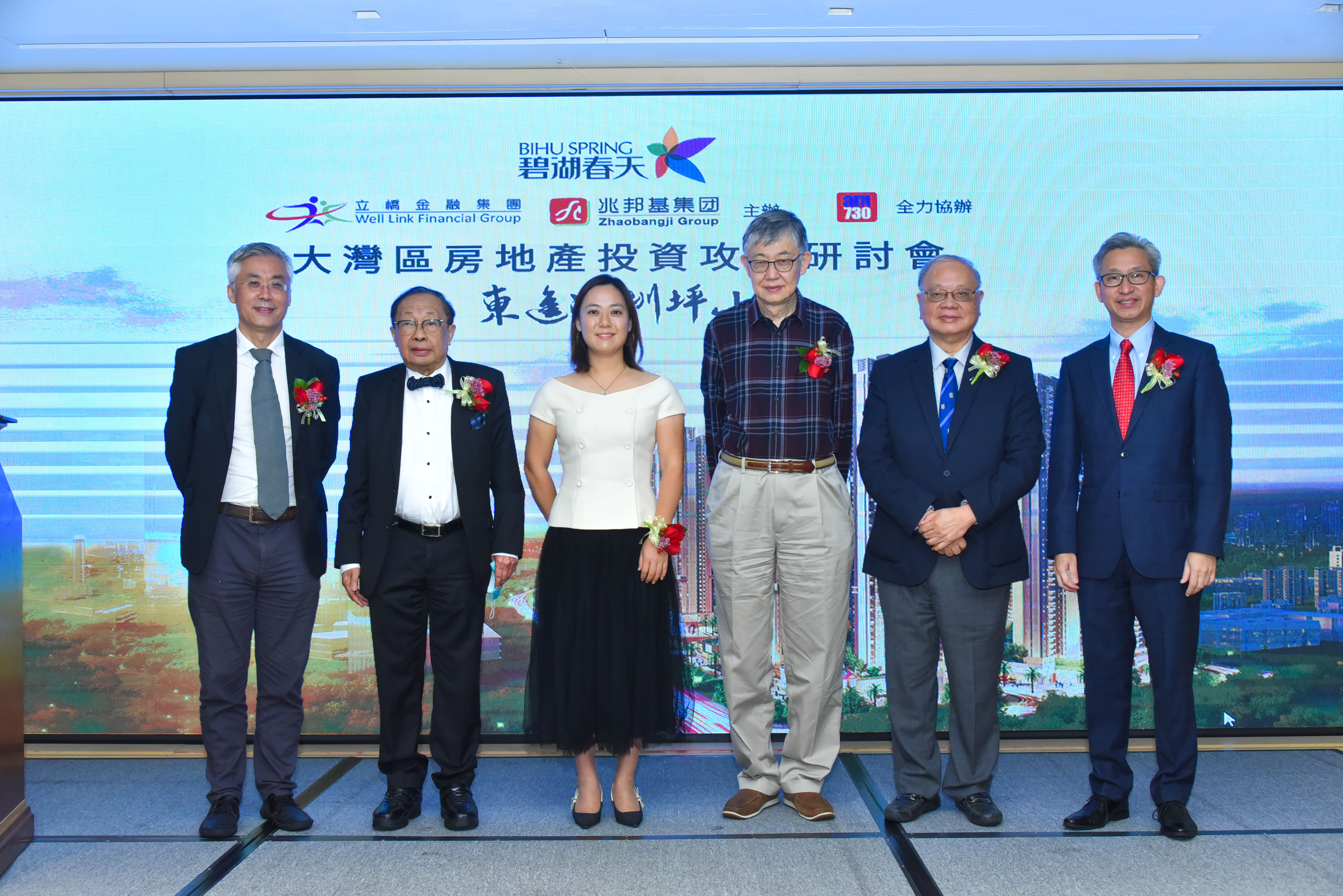 六位講者在碧湖春天沙盤旁合照,左起李滿能、詹美清、李焯芬、陳清泉、施永青、賈倍思。